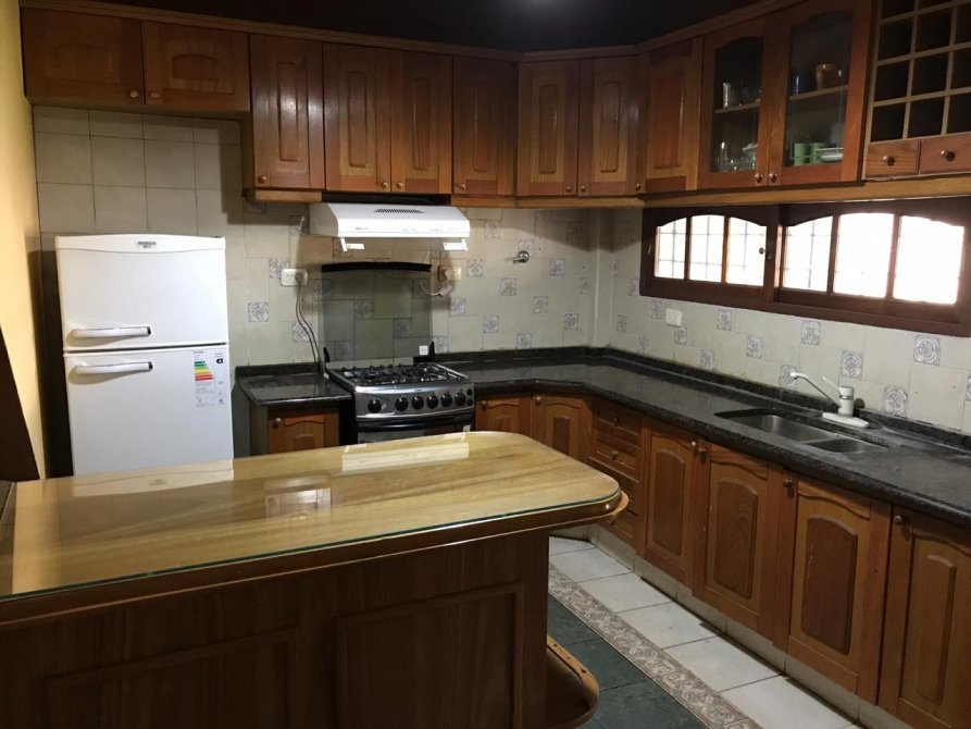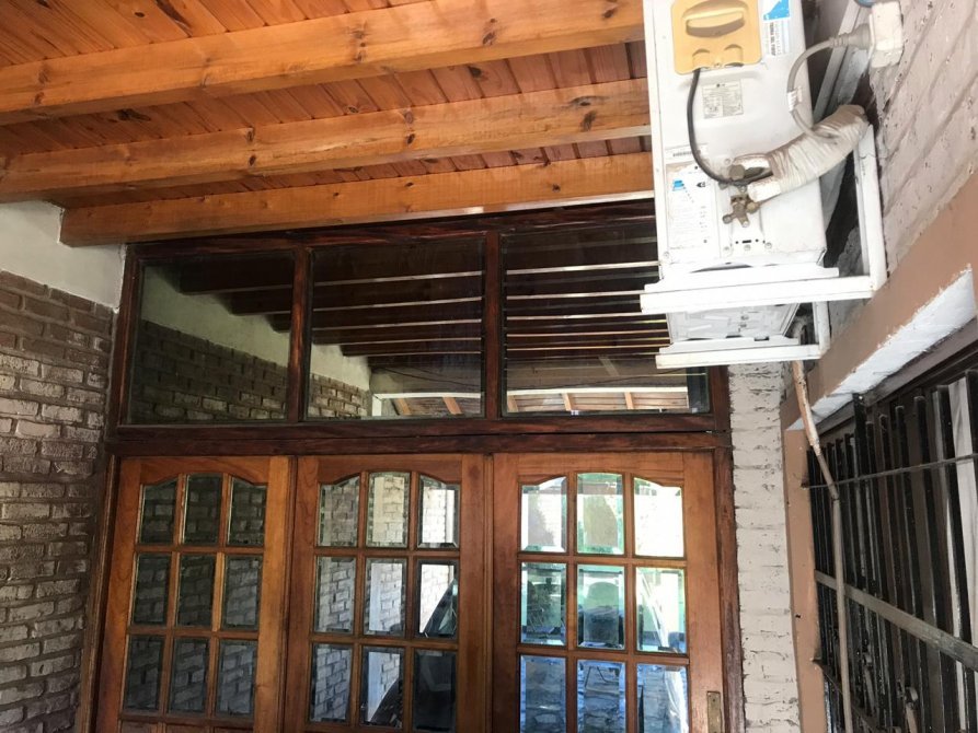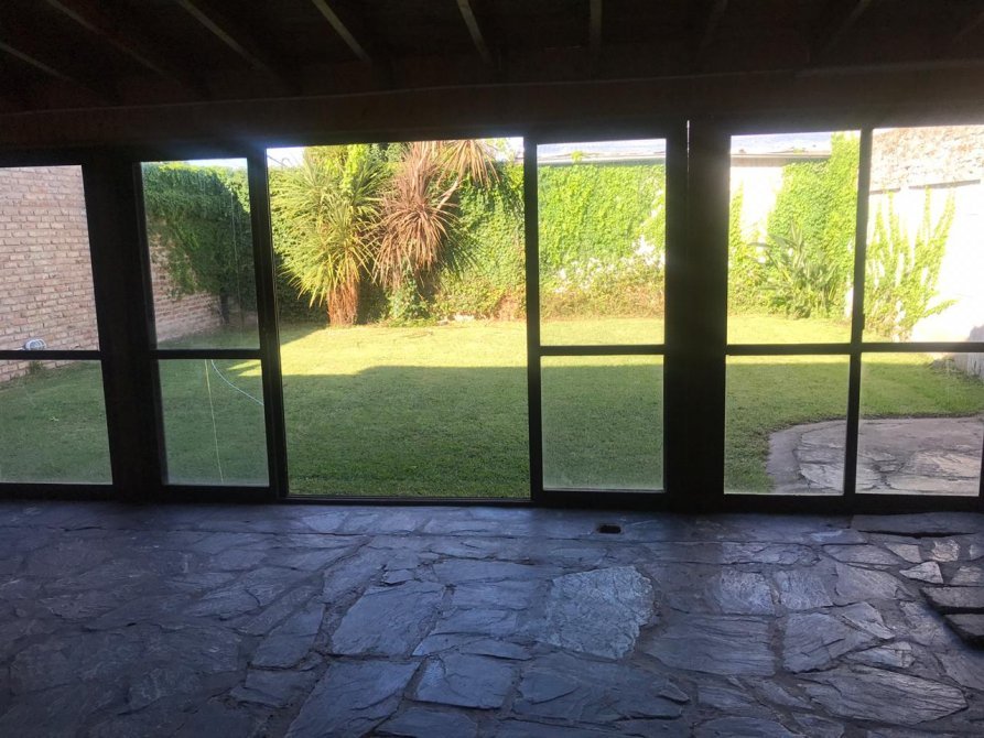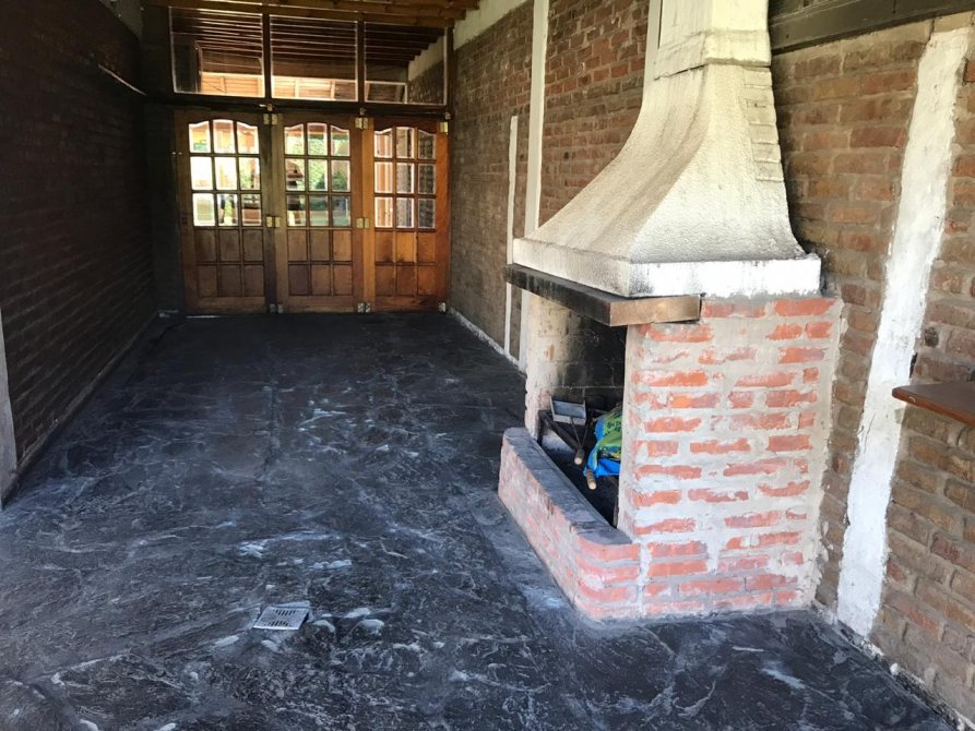 Desde la cocina se accede a una galeria cubierta que cuenta con un hogar con parrilla, con puertas corredizas de vidrio y se comunica con garage para dos autos.